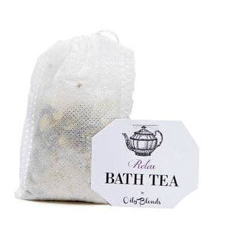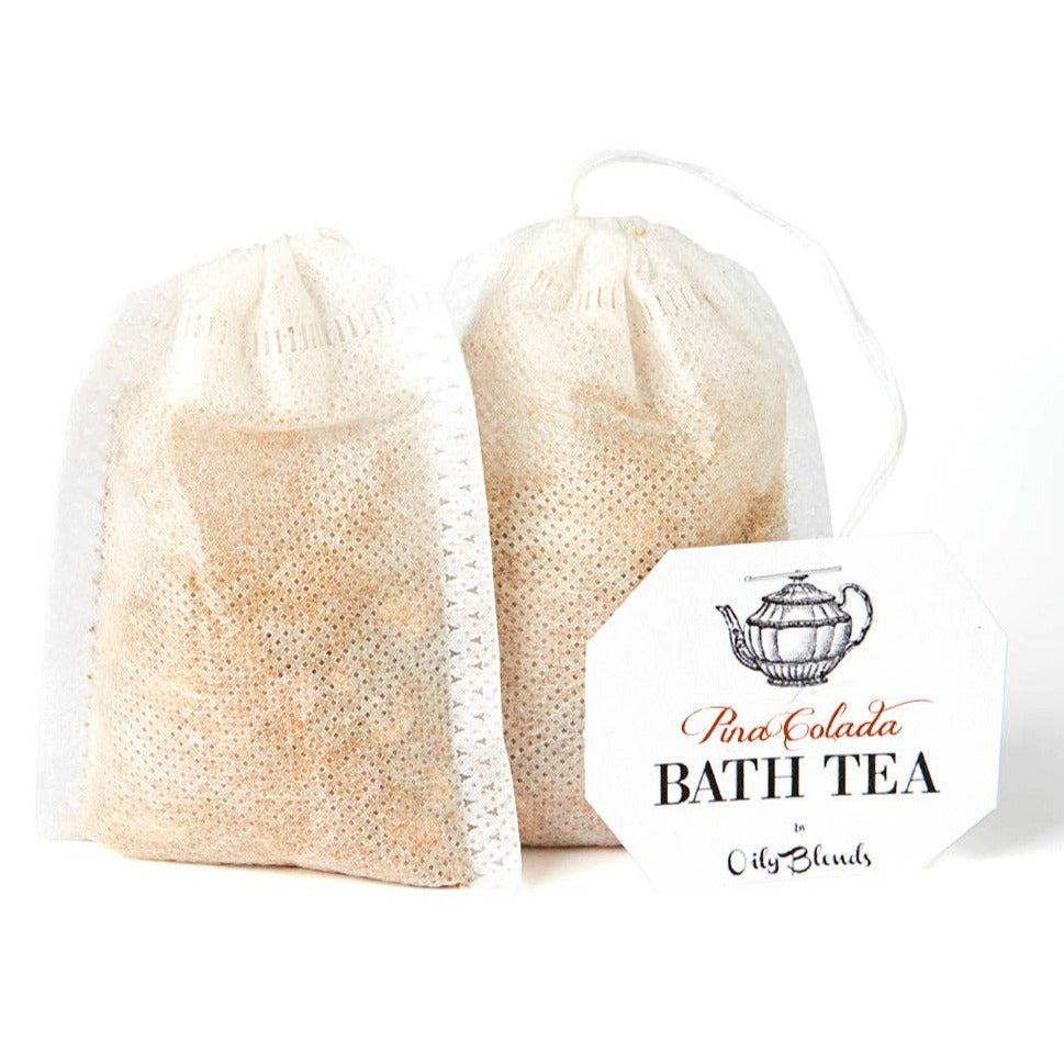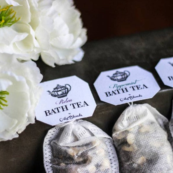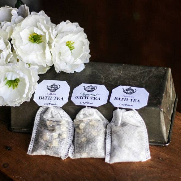 Available bath teas: Lavender, Peppermint, Sleep, Relax, Pina Colada, Pink Champagne, & Mimosa.