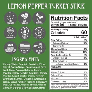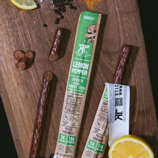 Lemon Pepper Citrus & Basil Turkey Stick - 100% Turkey - An homage to Bourbon Franklin's favorite fowl, this turkey stick is dusted with pepper and basil, and finished with a tart twist of lemon. Add this healthy turkey jerky snack stick to your next gift box.