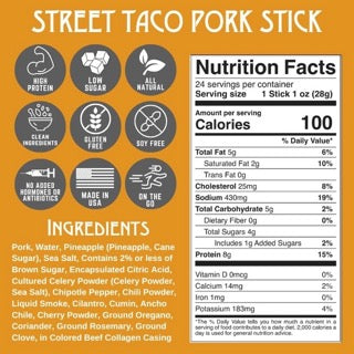 Street Taco Pork Stick - 100% Pork - A pork stick tossed in taco seasoning and chili powder, veiled in smoke, and crushed with fresh-cut pineapple. Inspired Al Pastor & Pineapple. Send the gift of a Taco Truck right to their front door!