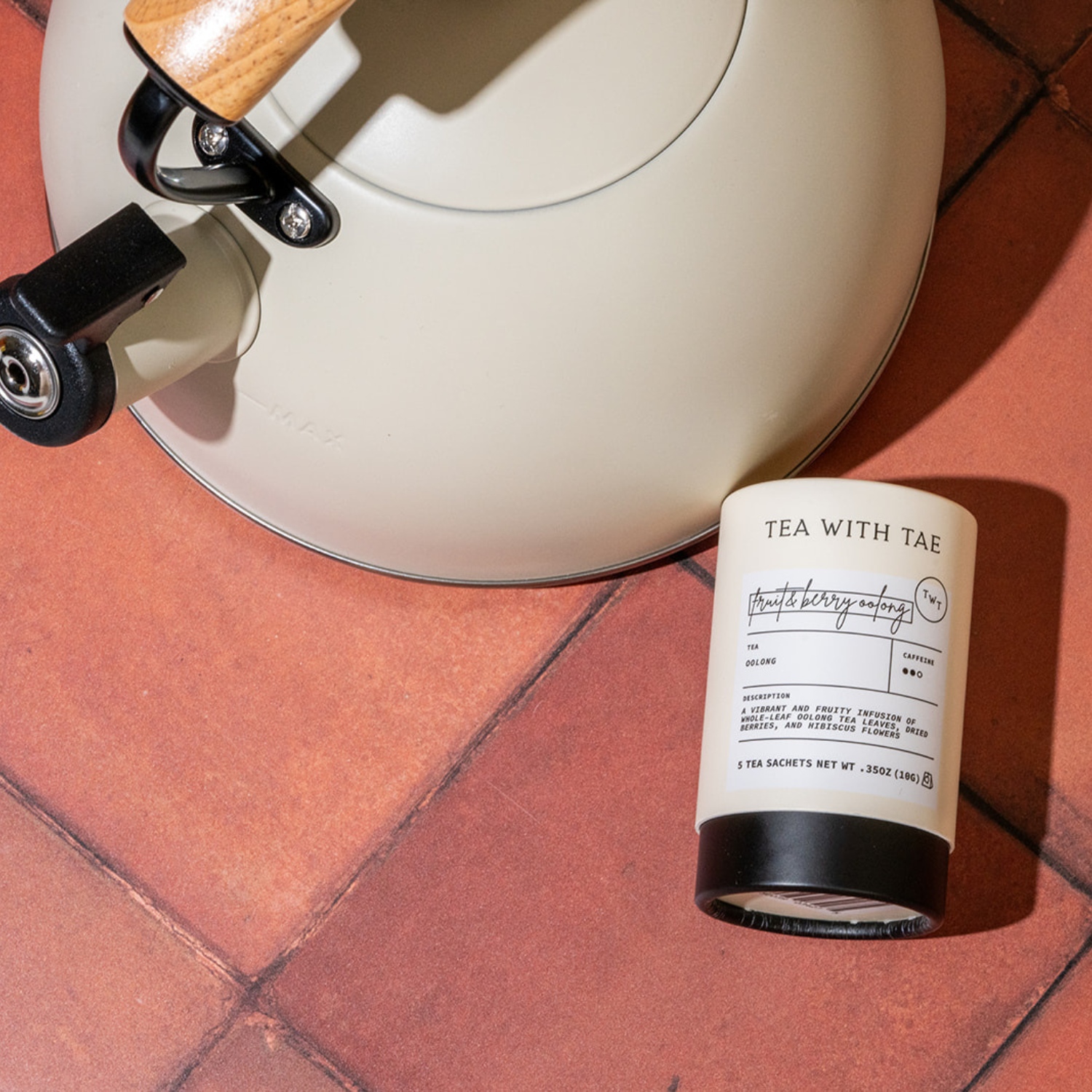 FRUIT & BERRY OOLONG: One of Tea with Tae's bestsellers and most flavorful teas. Made with legendary Ti Kuan Yin oolong leaves from China, our Fruit & Berry Oolong is a delectably sweet (but sugar-free!) blend of oolong, real dried fruit bits, and hibiscus flowers. Caffeine Level - Light