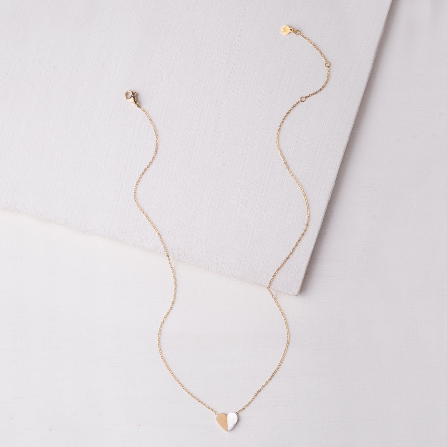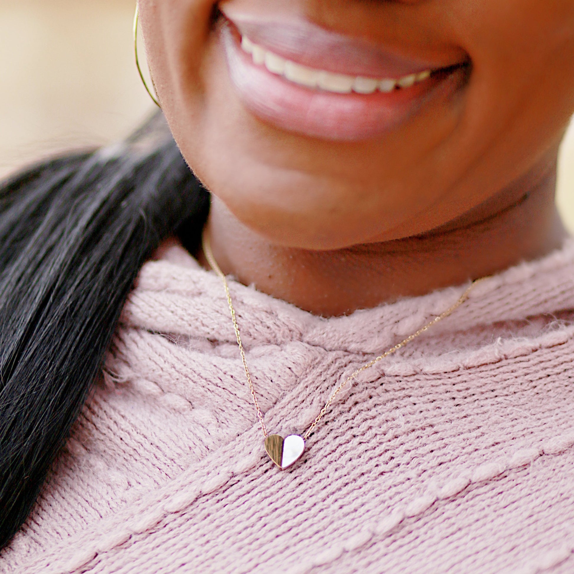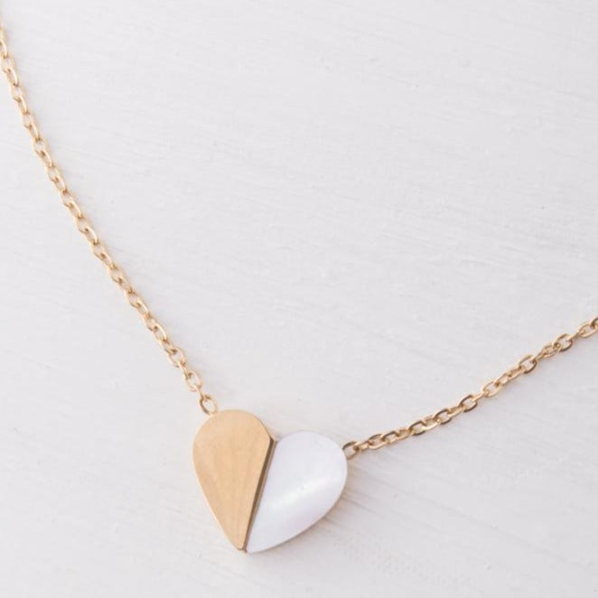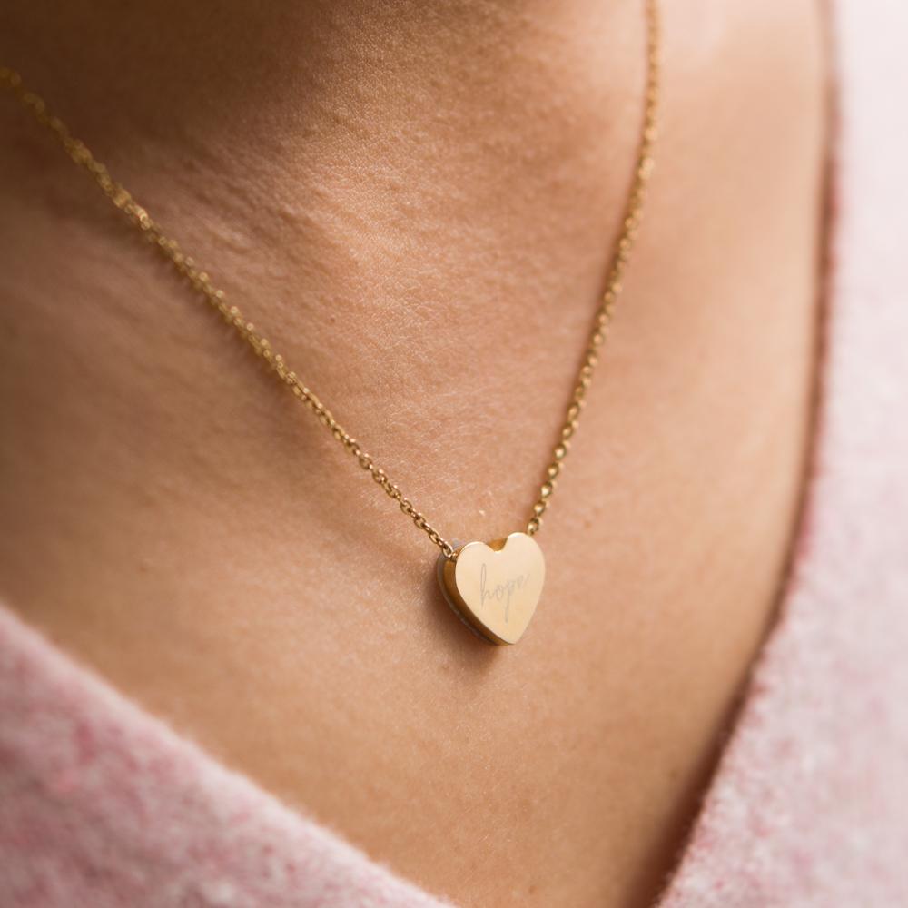 This necklace is double sided and can easily be worn either side out. One side is half 14k gold plated stainless steel and the other half mother of pearl. The opposite side is inscribed with the word 'hope'.
