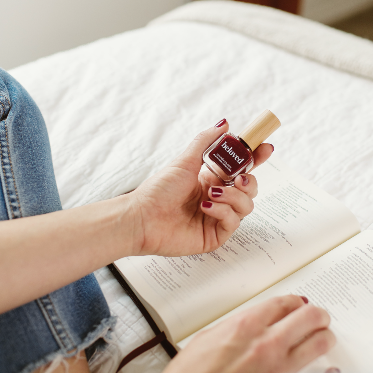 Every polish comes with an encouraging reminder, devotional and worship playlist. Our polish is non-toxic, 21-free, and vegan.