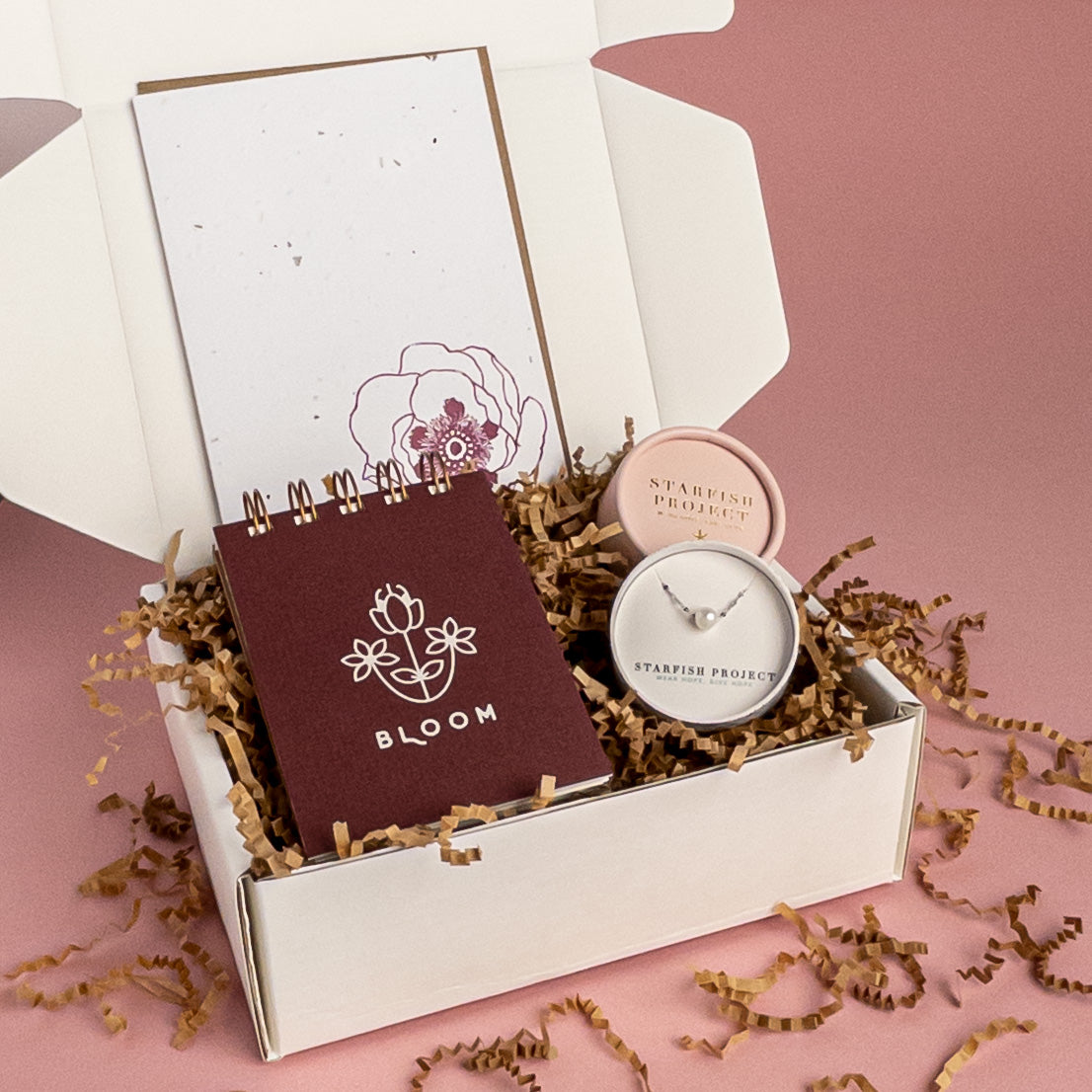 Let this unique gift box remind her of your love long after the thrill of opening the box is over. This single pearl necklace was handmade by a women in Asia who has survived sex-trafficking and is now thriving. This special greeting card can actually grow wildflowers if planted & watered for 10-14 days. And the mini jotter notebook is a perfect reminder of all the love she has planted in you and how it has come to bloom so beautifully!